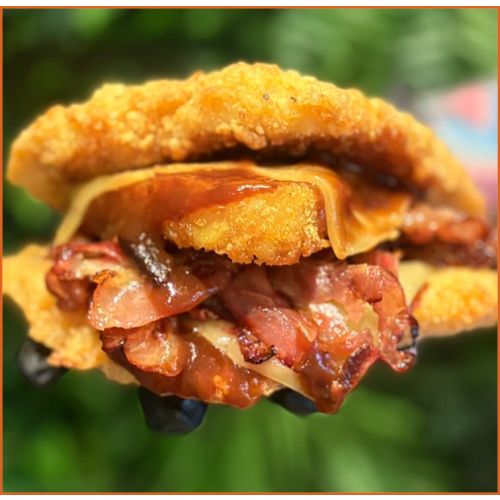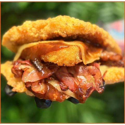 Twisted Chicken SandwichCrispy bacon, cheese, hash brown & BBQ sauce sauce sandwiched between 2 buttermilk chicken burgers