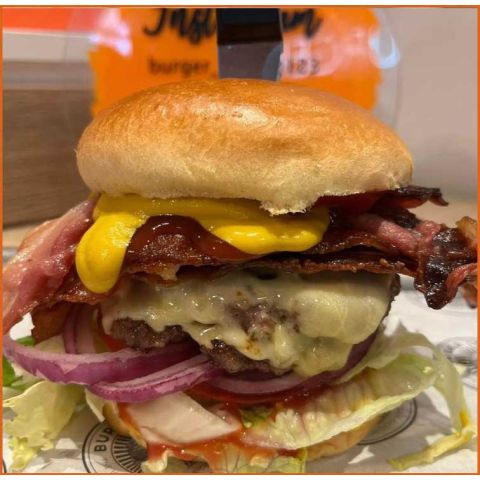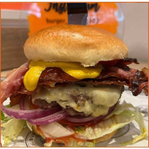Bacon Bad Boy gluten free bun2x Beef Patty, Monterey Jack Cheese, Streaky Bacon, Lettuce, Beef Tomato, Red Onion, Pickle, Ketchup and Mustard