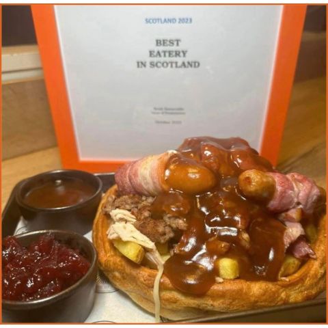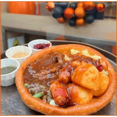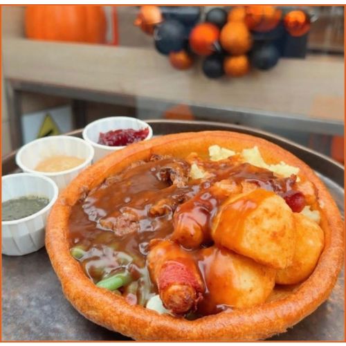 Yorkie Loaded FriesCrinkle cuts, grated mozzarella, stuffing, brisket, pigs n blankets topped with gravy