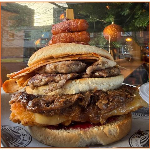 Festive ToastieSliced turkey, sausage patty, crispy bacon, stuffing, cranberry, sandwiched between 2 thick slices of brioche french toast with a pot of dipping gravy