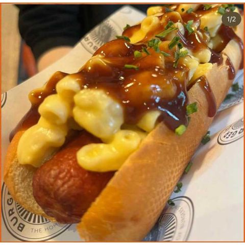 Mac & Cheese DogGerman Hot Dog, With Bacon Bits, Homemade Mac & Cheese & Bbq Sauce
