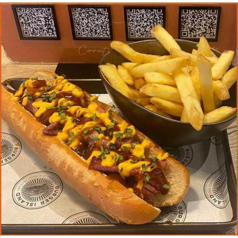 Chilli DogGerman Hot Dog, Mozzarella, House Chilli Dog, Jalapenos & Cheese Sauce -