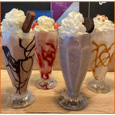 Chocolate MilkshakeMilk, Vanilla ice cream, Cadbury chocolate, chocolate sauce blended to a delicious 16oz thick shake topped with whipped cream -
