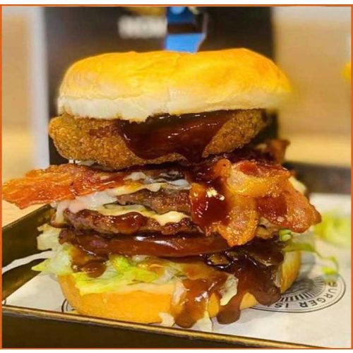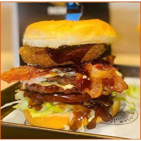 New York Burger(Beef Or Chicken) Monterey Jack Cheese, Crispy Bacon, Onion Ring, Lettuce, Tomato & Bbq Sauce -