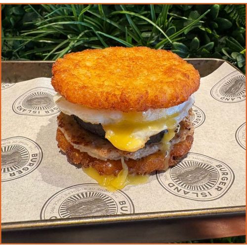 Hash Brown SandwichSausage patty, black pudding and egg sandwiched between two cripsy hash browns
