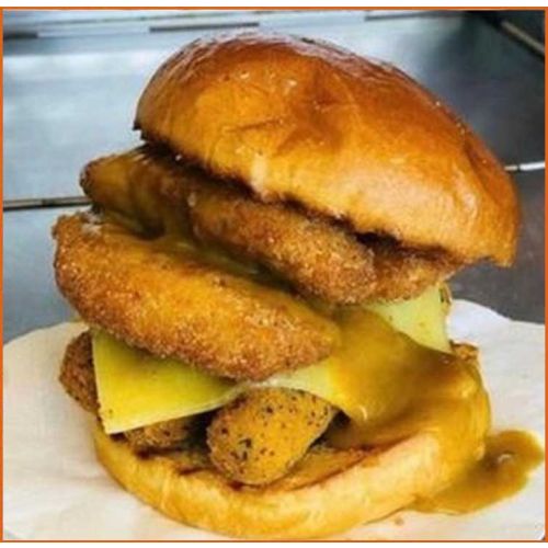 Salt & Pepper Stack BurgerSalt & Pepper Chicken Fillets, Mozzarella Sticks, Monterey Jack Cheese & Curry Sauce -