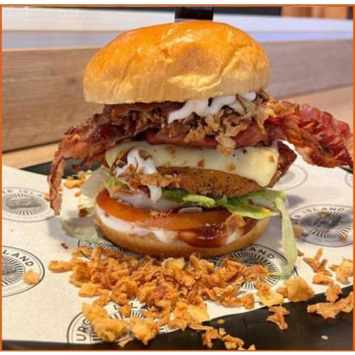 Highland Burger(Beef Or Chicken) Streaky Bacon, Award Winning Haggis & Peppercorn Sauce -