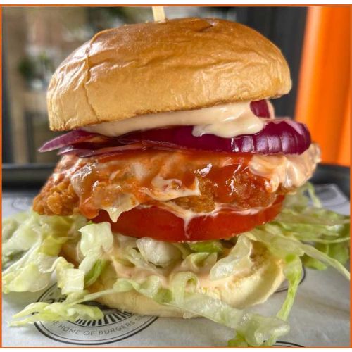 Spicy Chicken BurgerSpicy Chicken Fillet, Monterey Jack Cheese, Lettuce, Tomato, Red Onion, Spicy Mayo & Franks Hot Sauce -